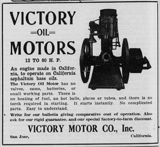 John sold his Ostenberg Gas Engine company for $75,000 and soon purchased the Victory Automobile Company shop. Victory had built automobiles in San Jose early 1900's and later became a general machine shop and automobile repair; 'Victory' referring to the then recent Spanish-American war. John used this new resource to design and build the Victory Oil Engine. Production began in San Jose with the 20HP Victory 2 cycle oil engine, but the city would not allow John to build a cupola to process iron into castings. John, and partners, then moved the Victory company to Niles California and purchased the derelict Ames Pump Company factory. The Victory company invested heavily in stocks of cast iron scrap and ingots just after the world war and thus did not have enough liquid assets to weather the business recession after the war; closing shop by 1927. The son of Mr. James, president of Victory (John was chief designer and inspector), gave me much information on the Victory Oil Engine Company.